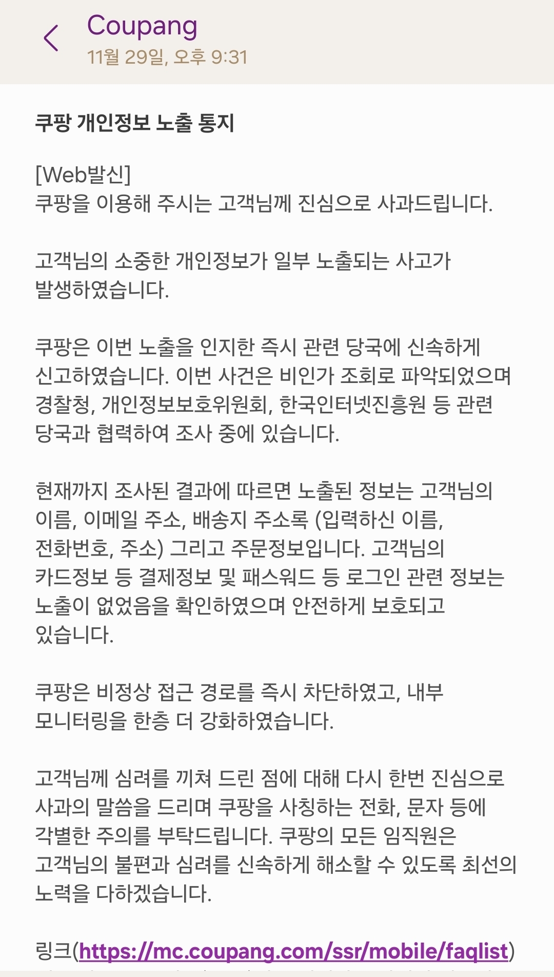 ํน์ ์ต๊ทผ ์ฟ ํก์ผ๋ก๋ถํฐ ๊ฒฝ๊ณ ๋ฌธ์, ์ ํ, ๋๋ โ๋ณด์ ํ์ธโ์ด๋ผ๋ ์ฐ๋ฝ์ ๋ฐ์๋ค๋ฉด ๋งํฌ ํด๋ฆญ/์ ๋ณด ์